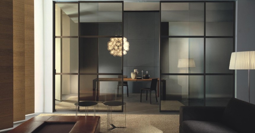 One of the most popular applications for glass partitions are studio apartments. The main problem in them is the combination of kitchen and living room. During cooking, all odors are transported into the room. To avoid this phenomenon, you can install a sliding glass partition that will divide the kitchen from the living room.